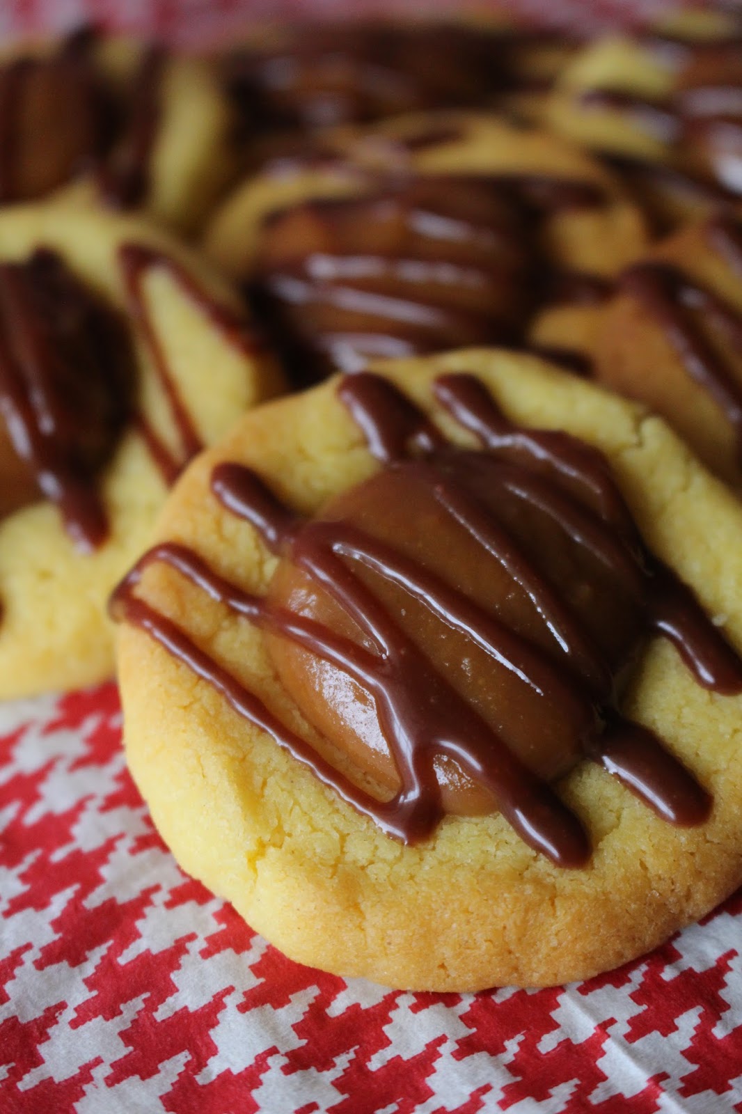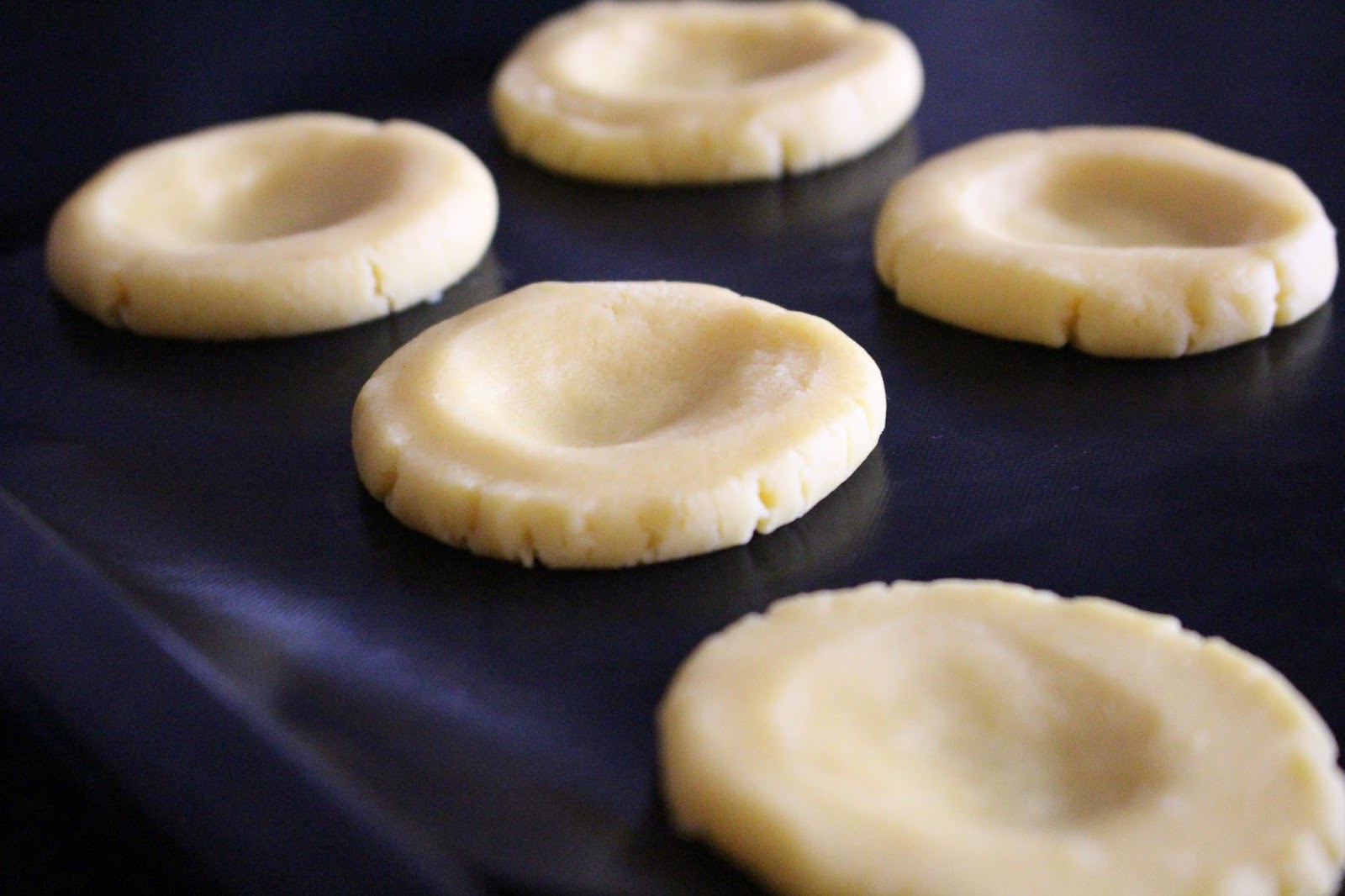 Fazer bolinhas com a massa e colocá-las numa superfície limpa. Amassar até formar biscoitos e usar o polegar para criar uma concavidade que vai mais tarde acolher o caramelo. Transferir para um tabuleiro forrado com papel vegetal ou uma superfície anti-aderente e levar ao frigorífico durante 1h.